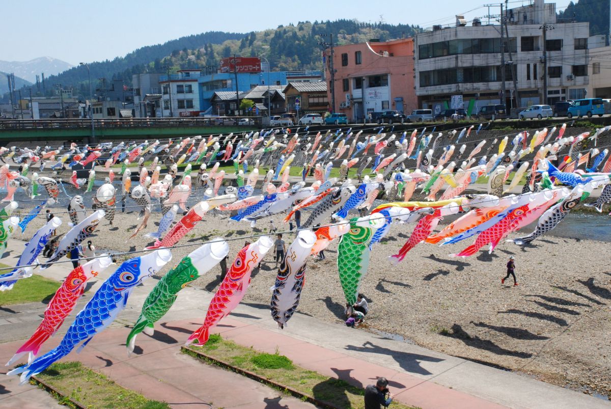 優雅に泳ぐこいのぼり 新潟県加茂市加茂川 地球の歩き方