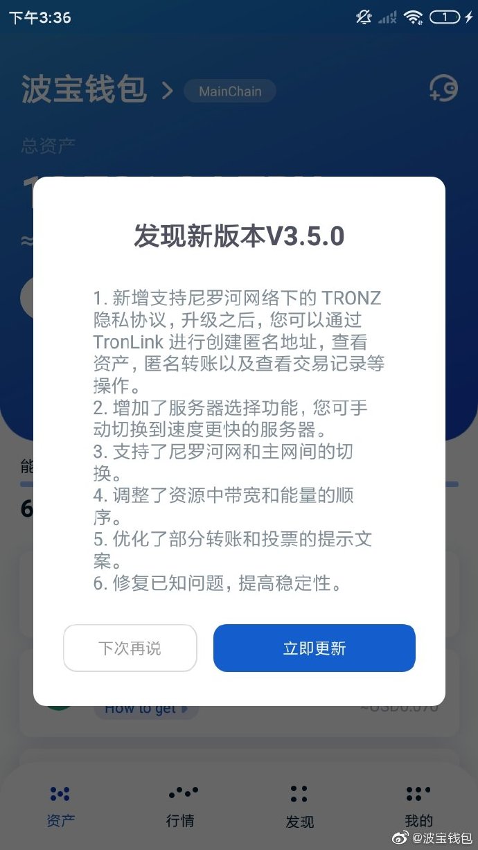 孙宇晨 Tronlink 安卓最新版本v3 5 0已正式发布 安卓用户进入 Tronlink 钱包app后 可看到更新提示 按步骤在app内操作即可 该版本新增支持尼罗河网络下的